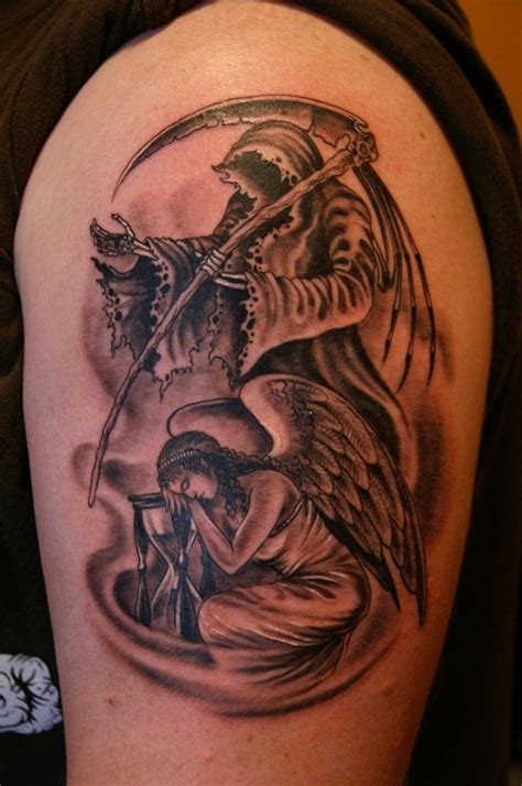 As guardian angels, they likewise exiled demons and concern. Top 12 death tattoos 1. There is definitely some significance to the tattoo whether it signifies a death or someone important. The tattoo artist really has their job cut out for them when they take on a big shoulder tattoo like this. Angel of death tattoo by phil tworavens.