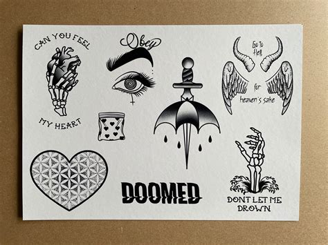 A3 tattoo flash sheet inspired by lyrics and song names by the band bmth. They are arguably one of the biggest rock bands on the planet, fusing the styles of metalcore and pop rock to bring heavy back to the mainstream. Select option 1 best friends 2 can you feel my heart 3 you can't drown my demons 4 don't.