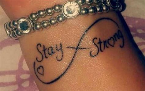 The cross next to this stay strong tattoo design, though, adds a much deeper meaning and symbolism. 9 years ago 9 years ago. When autocomplete results are available use up and down arrows to review and enter to select. A small but highly detailed wrist tattoo of the infinity symbol. A handwritten stay strong tattoo design is simple and pretty.